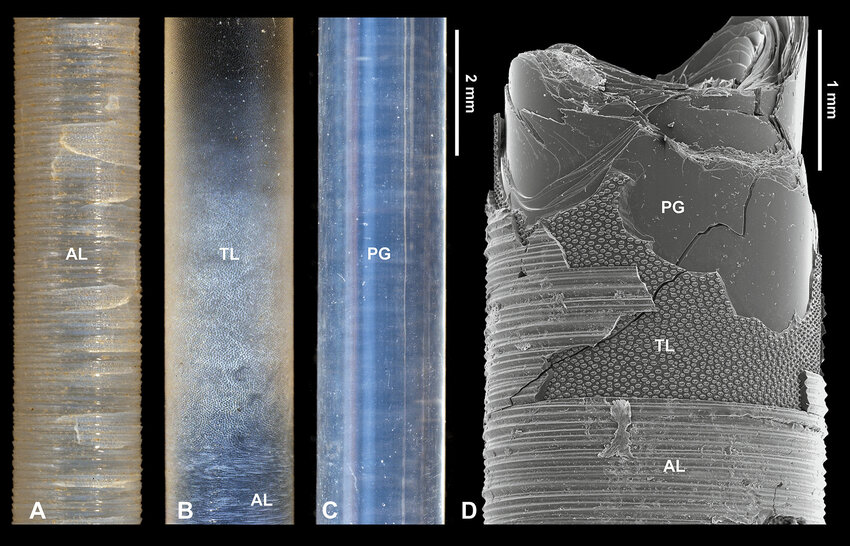 Cechy morfologiczne spikuli na całej jej długości w świetle odbitym (a–c) oraz w SEM (d). a Dolna część spikuli ukazująca powierzchnię pierścieniową (AL). b Obszar pośredni ukazujący warstwy pierścieniową (AL) i gruźliczą (TL). c Górna część spikuli ukazująca gładką szklistą powierzchnię (PG). d Złamana dolna część spikuli ukazująca wszystkie trzy nałożone na siebie jednostki strukturalne